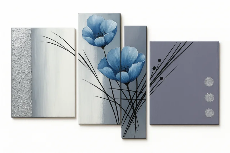 Quadro polittico moderno composto da quattro pannelli che si fondono in un’unica composizione armoniosa.